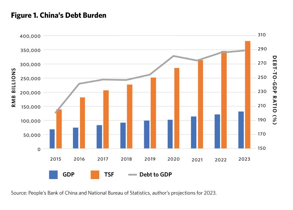 1 Chinese debt levels are often compared to those of the United States and the European Union (EU), but there are at least two reasons why these comparisons make little sense. First, and most obviously, even the most cursory glance at comparable debt levels globally makes clear that more advanced economies are able to sustain higher debt levels than less advanced economies. Second, and more importantly, most government debt (the largest category) in the United States and the EU is created to fund transfers among different sectors of the economy. A much smaller share of U.S. or EU debt, in other words, is associated with the systematic overvaluation of domestic assets than Chinese debt, and so does not require the writing down of fictitious wealth. In a February 8, 2022, paper, I discussed how excessively high debt levels can affect an economy. In an August 23, 2021, paper, I reintroduced and expanded John Kenneth Galbraith’s concept of the “bezzle,” or fictitious wealth, and explained how it matters to the Chinese economy.
