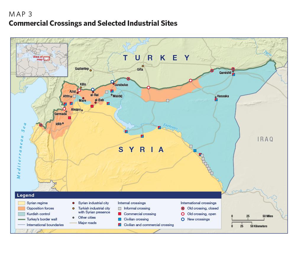One of the most telling examples of Turkey’s attempt to build a more stable economy in the north is its support for the creation of industrial zones, which, unlike trade, requires committed capital as well as a medium- to long-term commitment and stability. In the past few years, Ankara has announced several industrial zones—in Al-Bab, Al-Rai, Jarablus, and elsewhere (see map 3). The Turkish side has signaled its support for such initiatives through official visits, such as the one undertaken by its interior minister to Al-Rai in December 2021.72 From Turkey’s perspective, economic stability in northern Syria would not only discourage outmigration, but could also encourage Syrians living in Turkey to return.