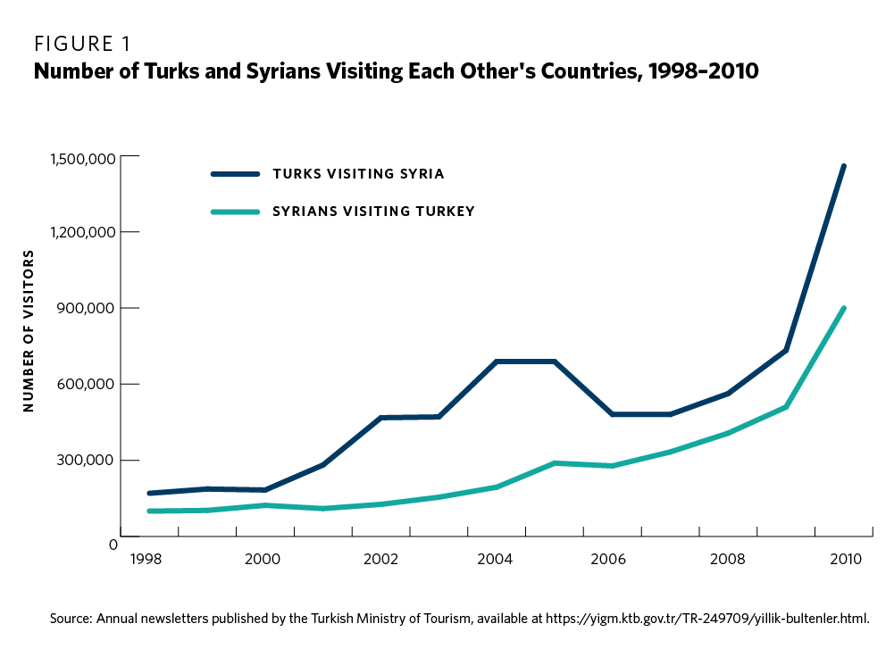 As relations improved, more Syrians and Turks visited each other’s country. According to Syrian official data, the number of Turkish nationals who visited Syria increased from 170,000 in 1998 to 730,000 in 2009, which doubled to 1.45 million in 2010, as a visa liberalization regime entered into effect. According to Turkish official data, the number of Syrians entering Turkey also increased, though more gradually, going from about 100,000 in 1998 to 900,000 in 2010 (see figure 1).22