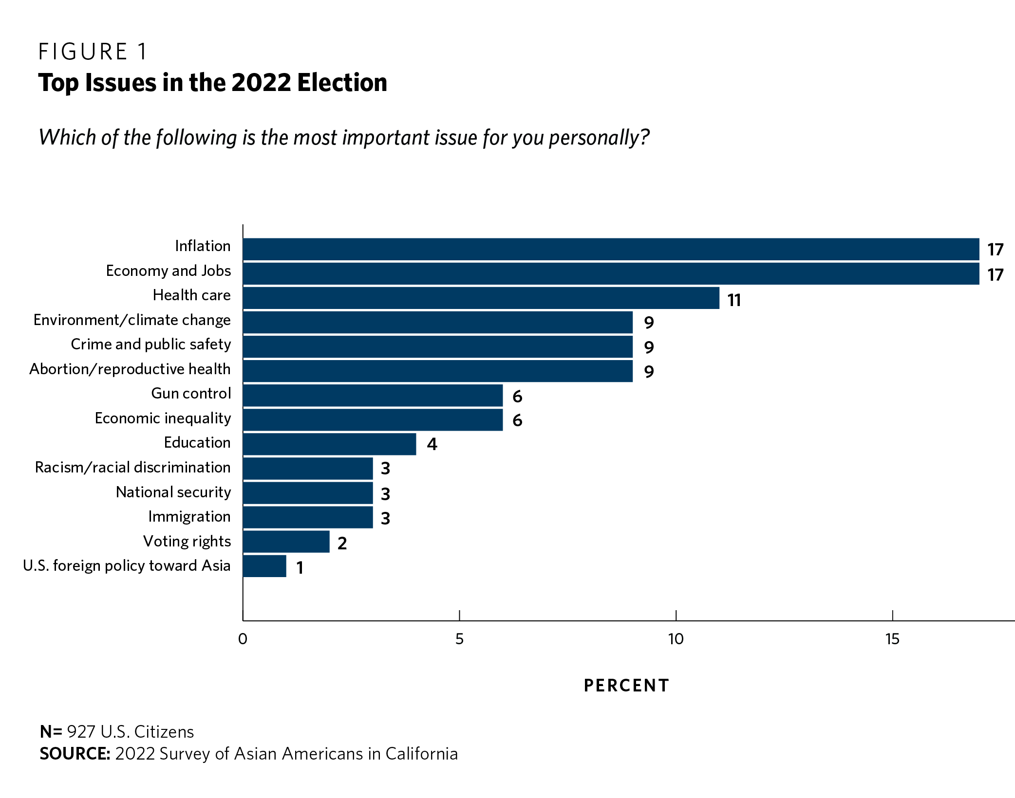 The first article in this series on the social attitudes and political preferences of Asian Americans in California highlighted kitchen-table issues as front-and-center in the minds of many respondents as the midterm election season approaches. When asked which issue is the most important to them as they prepare to cast their ballot in November, inflation and the economy/jobs were the most popular responses, each named by 17 percent of survey participants (see figure 1).