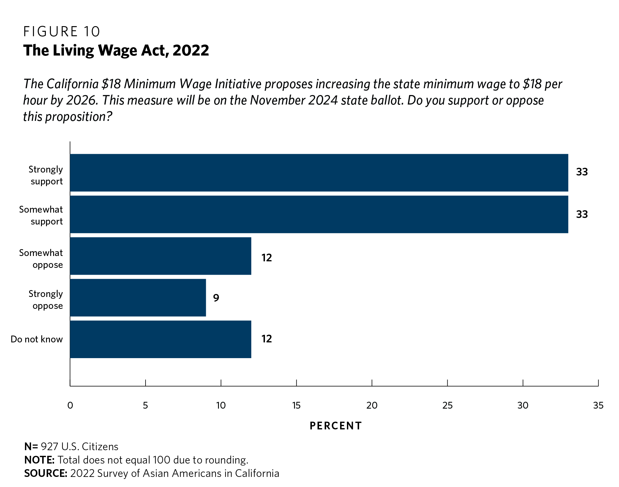 Finally, the survey asked about a popular initiative that will show up on California’s 2024 ballot. In 2016, the California legislature passed a bill raising the state’s minimum wage to $15 per hour. In November 2024, California voters will vote on a popular initiative (known as the California $18 Minimum Wage Initiative) that, if passed, will increase the minimum wage to $18 by 2025 and adjust it further each subsequent year in accordance with inflation.