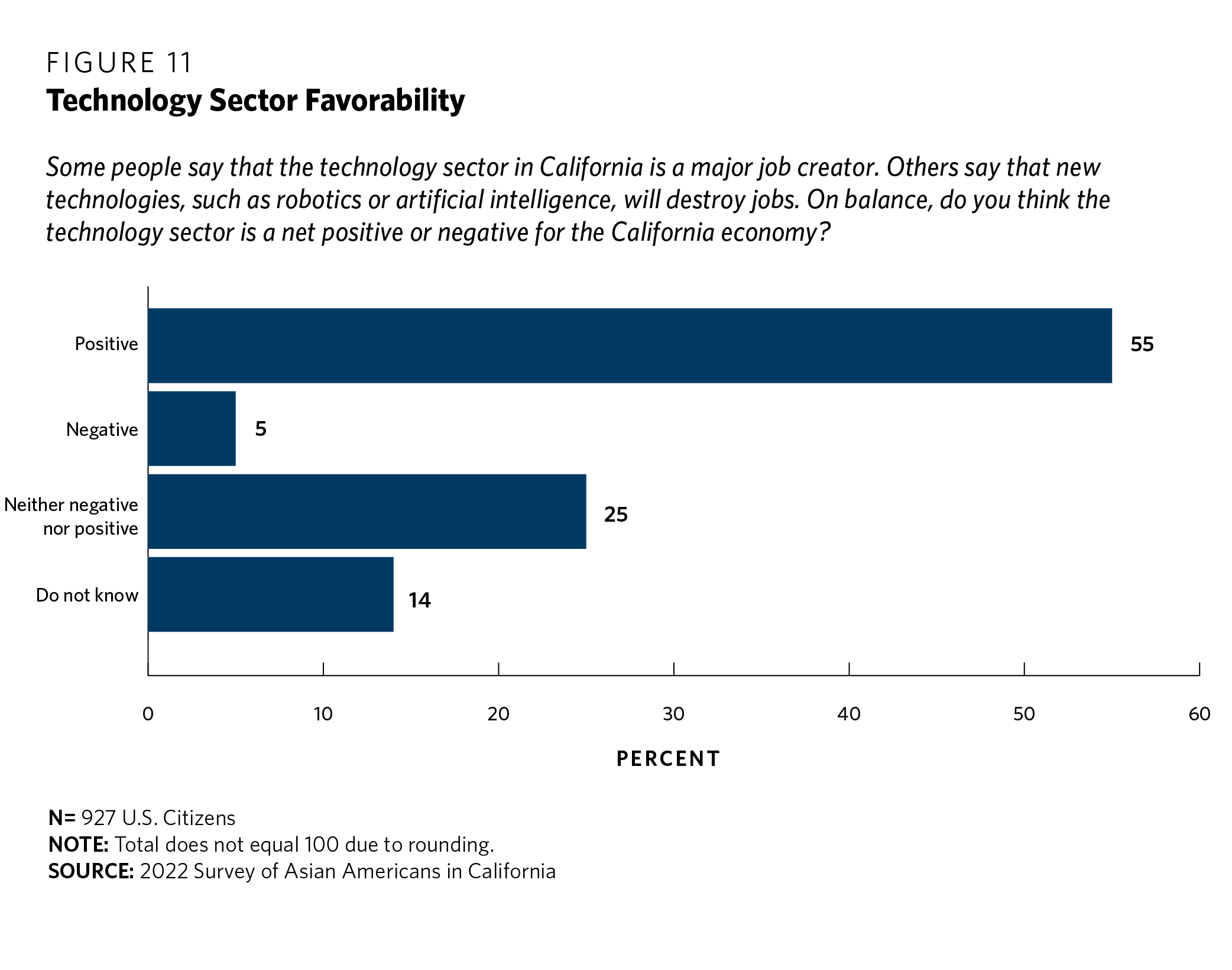 Fifty-five percent of respondents reported that the tech sector is a net positive for the California economy (see figure 11). Only 5 percent believed it is a net negative, and 25 percent stated it is neither a negative nor a positive. An additional 14 percent did not have an opinion.
