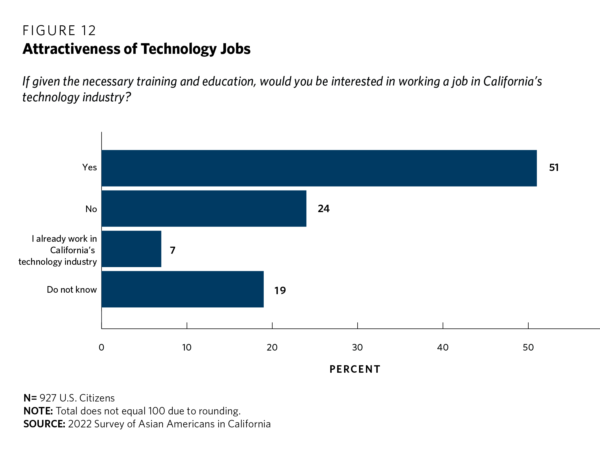 The survey then asked respondents whether, if given the necessary training and education, they would be interested in working a job in California’s technology industry. The data suggest a narrow majority—51 percent—who indicated that they would indeed be interested in finding a job in the state’s tech sector (see figure 12). Seven percent of respondents indicated they already work in the tech sector, so the share of those positively disposed is presumably even higher. However, a significant proportion, nearly one-quarter (24 percent) of respondents, reported that they would not be interested in the tech sector, and 19 percent did not know where they stand on the question.