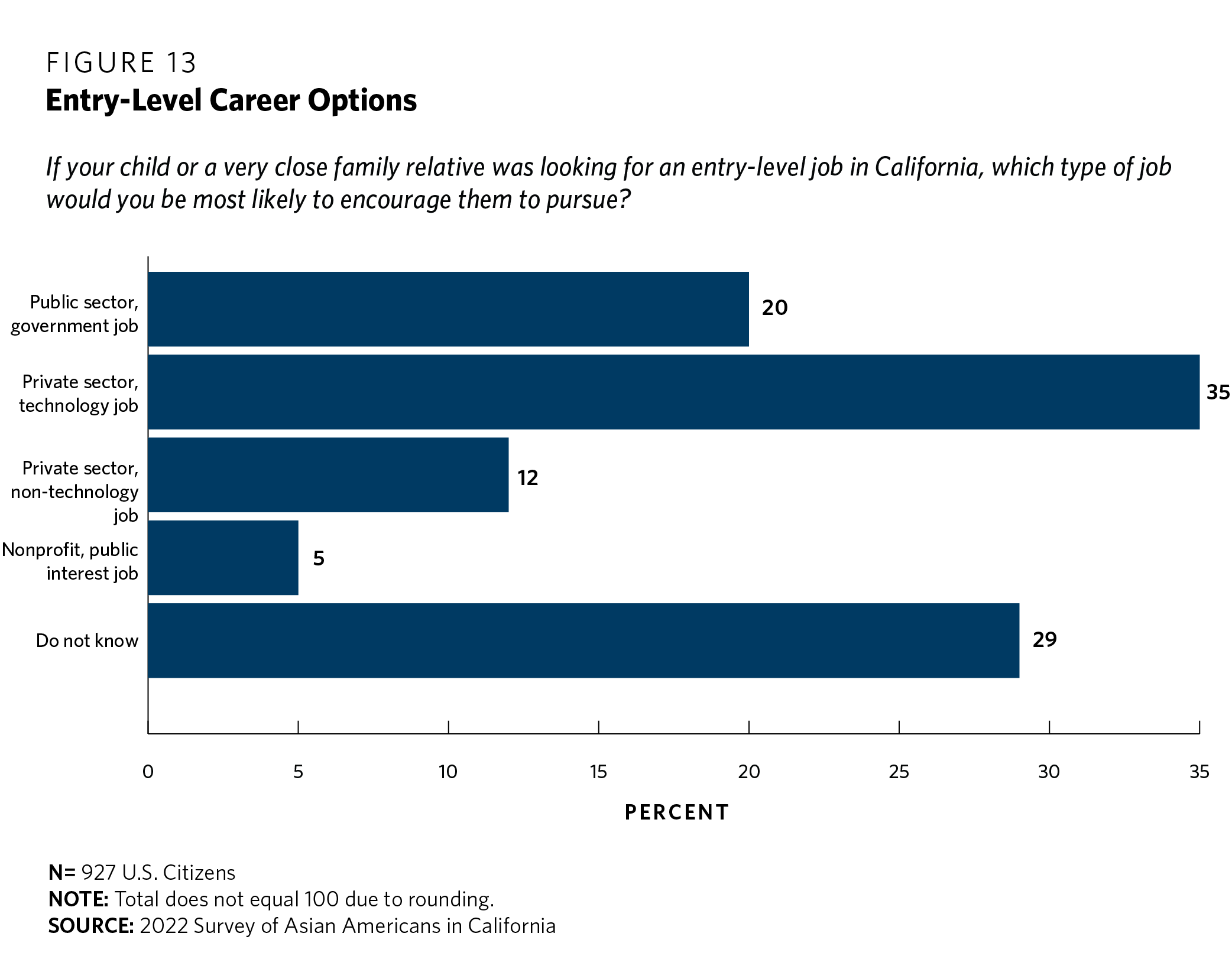 Another way of gauging perceptions of the tech sector is to ask whether respondents would encourage a relative to seek employment in the tech field. The survey asked respondents what type of entry-level job they would encourage their child or close family relative to pursue in the state of California. Respondents were asked to select from four options: public sector/government job, private sector technology job, private sector nontechnology job, or a nonprofit/public interest job. Respondents’ opinions were highly mixed on this question (see figure 13).