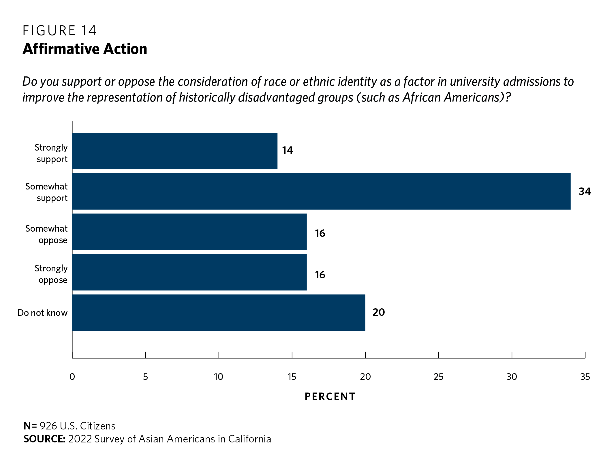 The Carnegie survey considered the subject of affirmative action as well, asking respondents whether they support or oppose the consideration of race or ethnic identity as a factor in university admissions to improve the representation of historically disadvantaged groups (such as African Americans). The data, once again, revealed a mixed picture (see figure 14). When framed in these terms, 48 percent either “strongly” or “somewhat” supported affirmative action. Thirty-two percent, in turn, either “strongly” or “somewhat” opposed the proposition. Twenty percent of respondents did not express an opinion either way.
