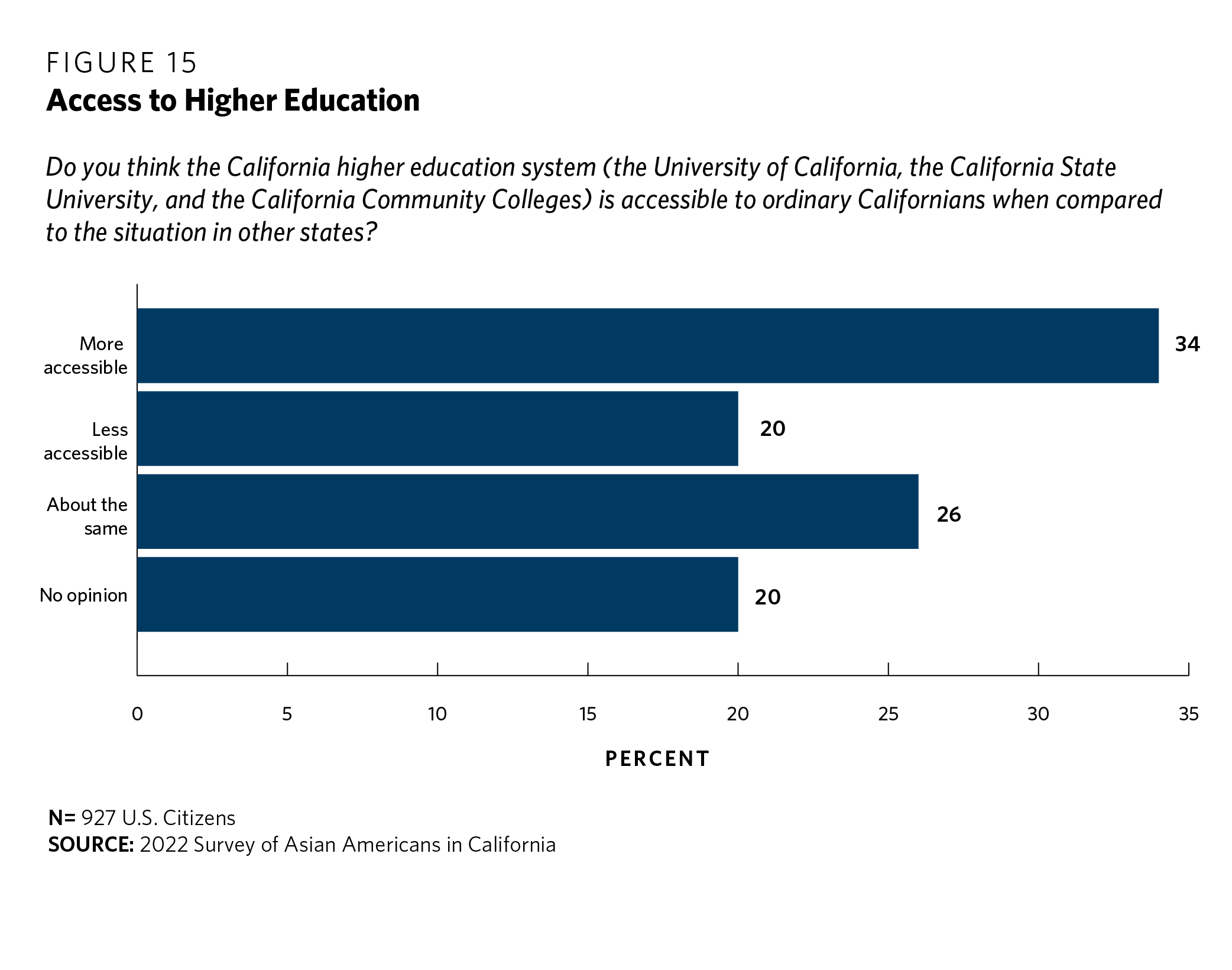 Respondents were very divided on this question (see figure 15). One-third of respondents (34 percent) reported that the California higher education system is more accessible to ordinary residents than in other states. Twenty percent thought the California system is less accessible, 26 percent felt it is about the same, and 20 percent expressed no opinion.