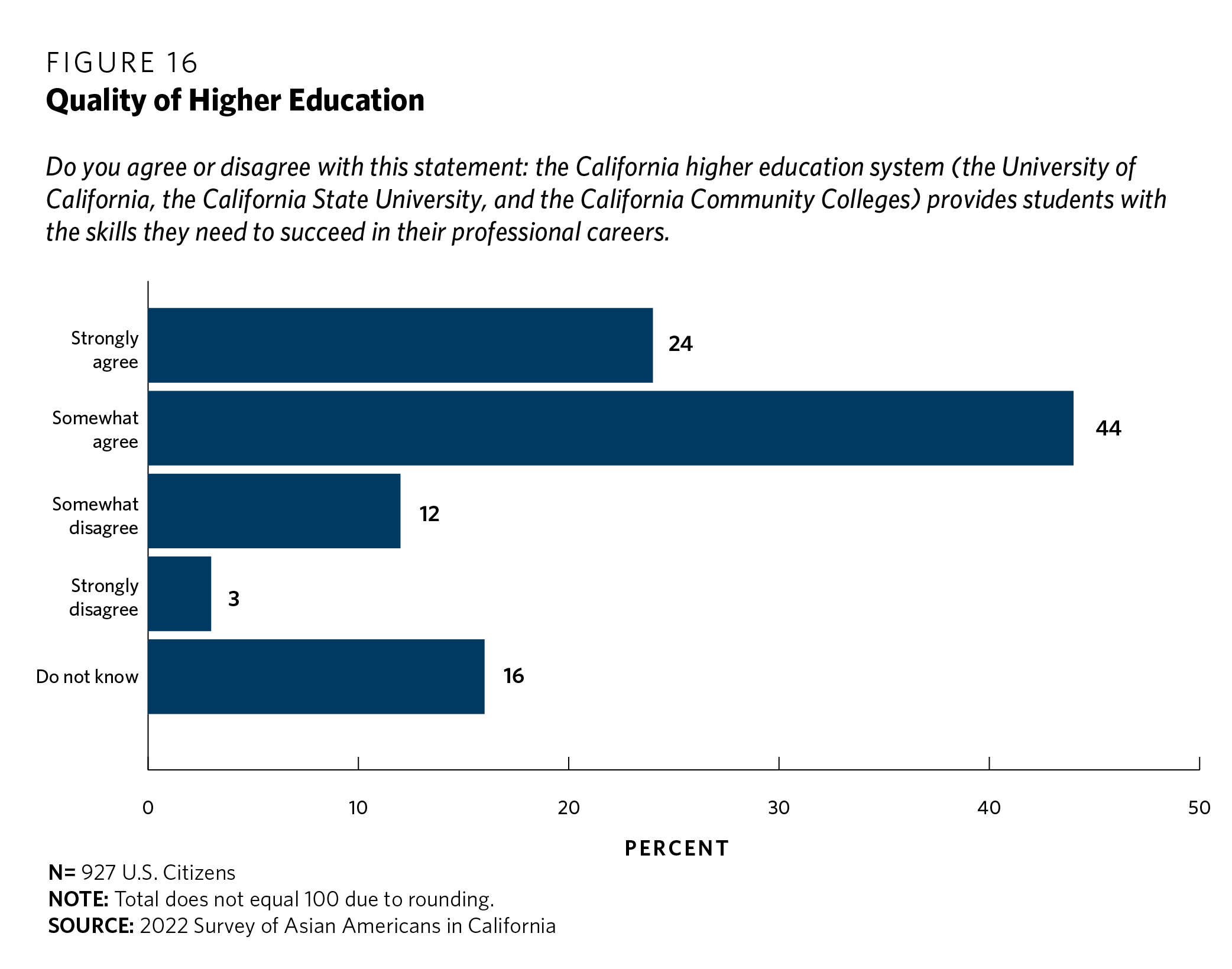 On the question of quality, respondents were more bullish on the state of higher education (see figure 16). The survey asked respondents whether they agree or disagree that California’s system of higher education provides students with the skills they need to succeed in professional careers. Sixty-eight percent either “strongly” or “somewhat” agreed with the proposition. Only 15 percent disagreed with the notion, and another 16 percent did not express an opinion.