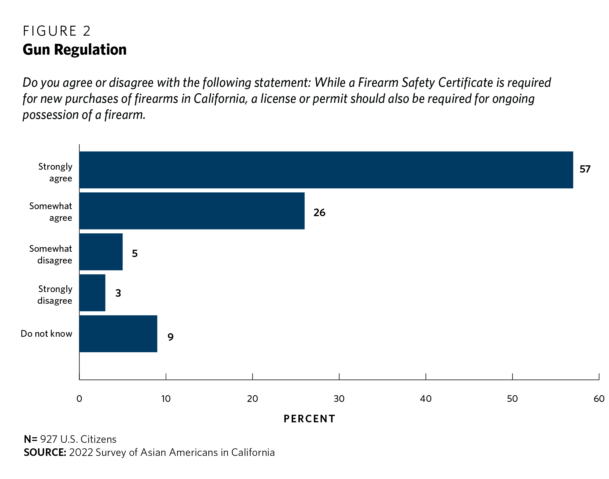 The Carnegie survey polled Asian Americans along similar lines. California requires individuals who wish to purchase a handgun to obtain a Firearm Safety Certificate. The survey probed whether respondents agree or disagree with a license or permit requirement for ongoing possession of a firearm, as opposed to only new purchases.
