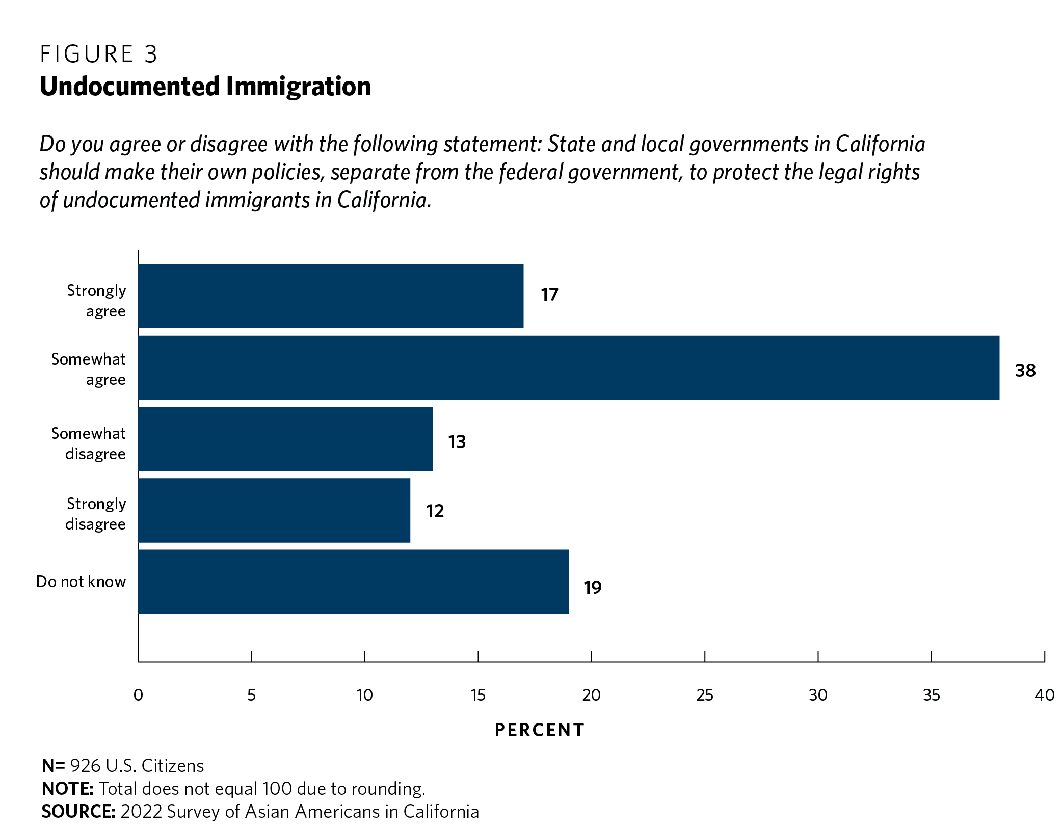 The Carnegie survey asked respondents if they agree or disagree with allowing state and local governments in California to maintain the ability to make their own policies to protect the legal rights of undocumented migrants, independent of federal government action. A clear majority, 55 percent, of Asian American respondents agreed with the proposition (see figure 3). Twenty-five percent disagreed, and another 19 percent did not have an opinion.