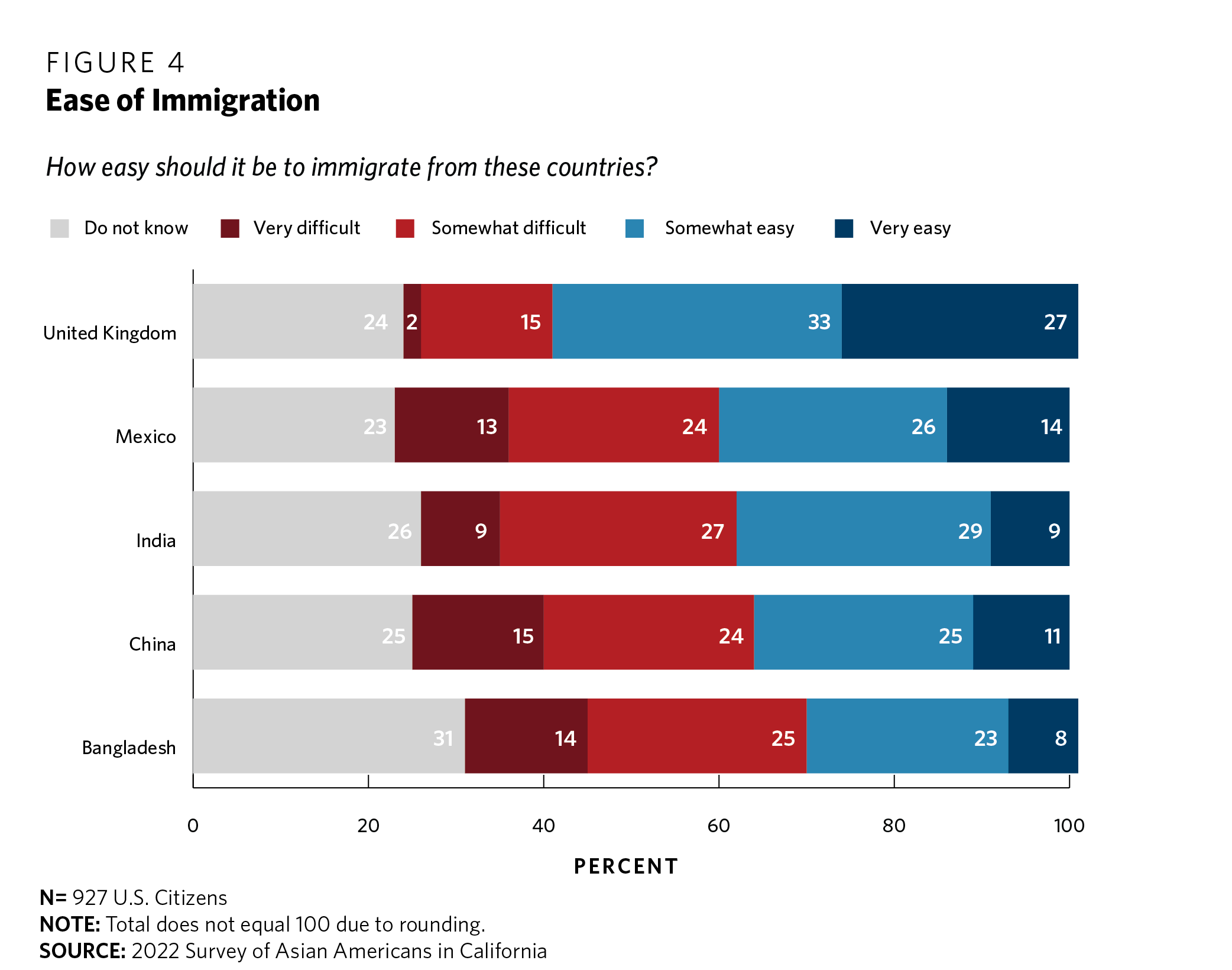 It is possible that respondents might hold different views toward different categories of immigrants. For instance, they might be more inclined to favor greater immigration from Asian countries but less inclined to accept immigration from other sending countries. To probe this possibility, the survey asked respondents how easy it should be for individuals to immigrate to the United States from a list of selected countries. The list of countries included Bangladesh, China, India, Mexico, and the United Kingdom. The results are contained in Figure 4.