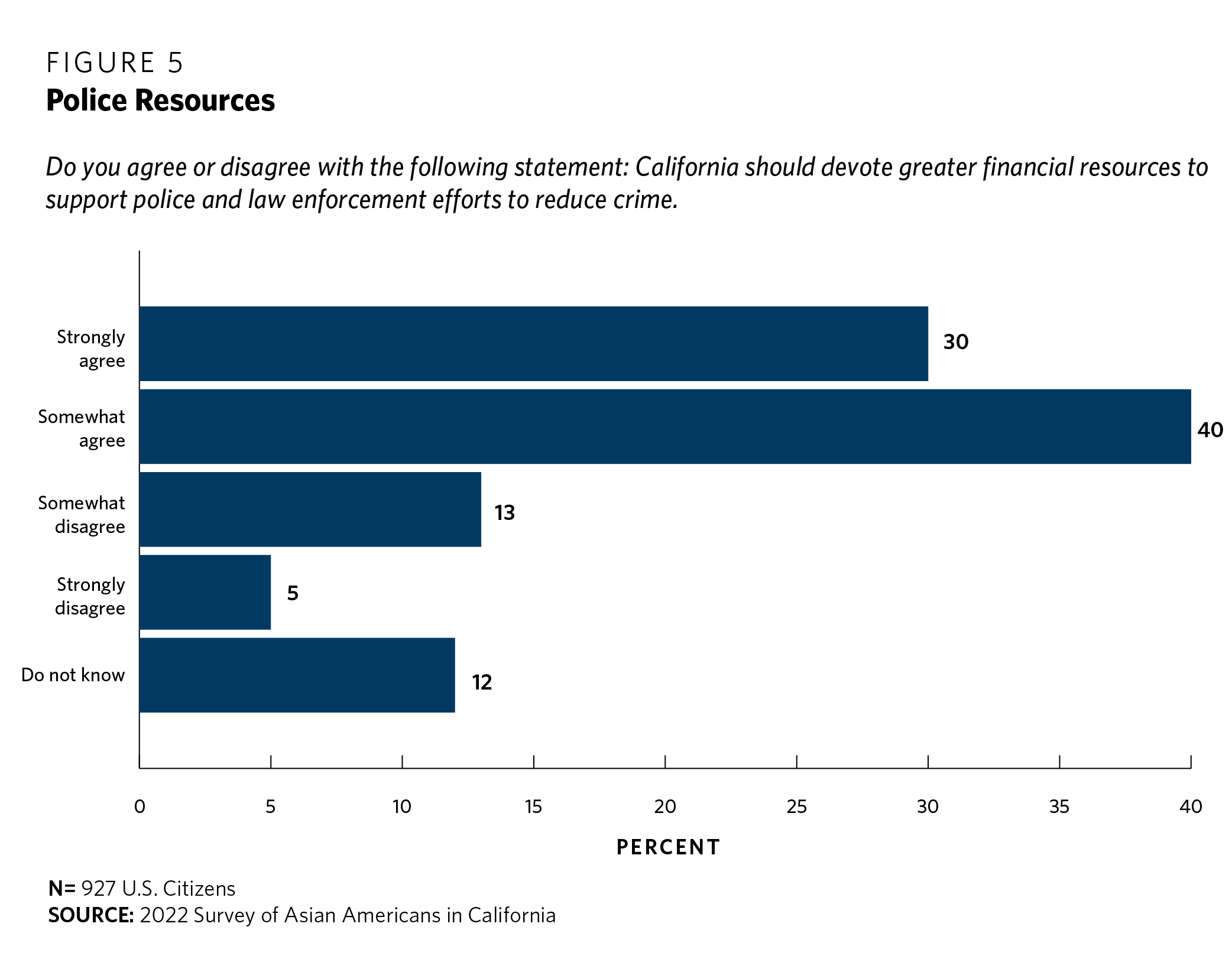 The survey asked respondents whether they agree or disagree with California devoting greater financial resources to support police and law enforcement efforts to reduce crime. A strong majority—70 percent—of respondents agreed, reflecting an overarching concern with public safety (see figure 5). Just 18 percent of respondents disagreed, and 12 percent did not express an opinion.