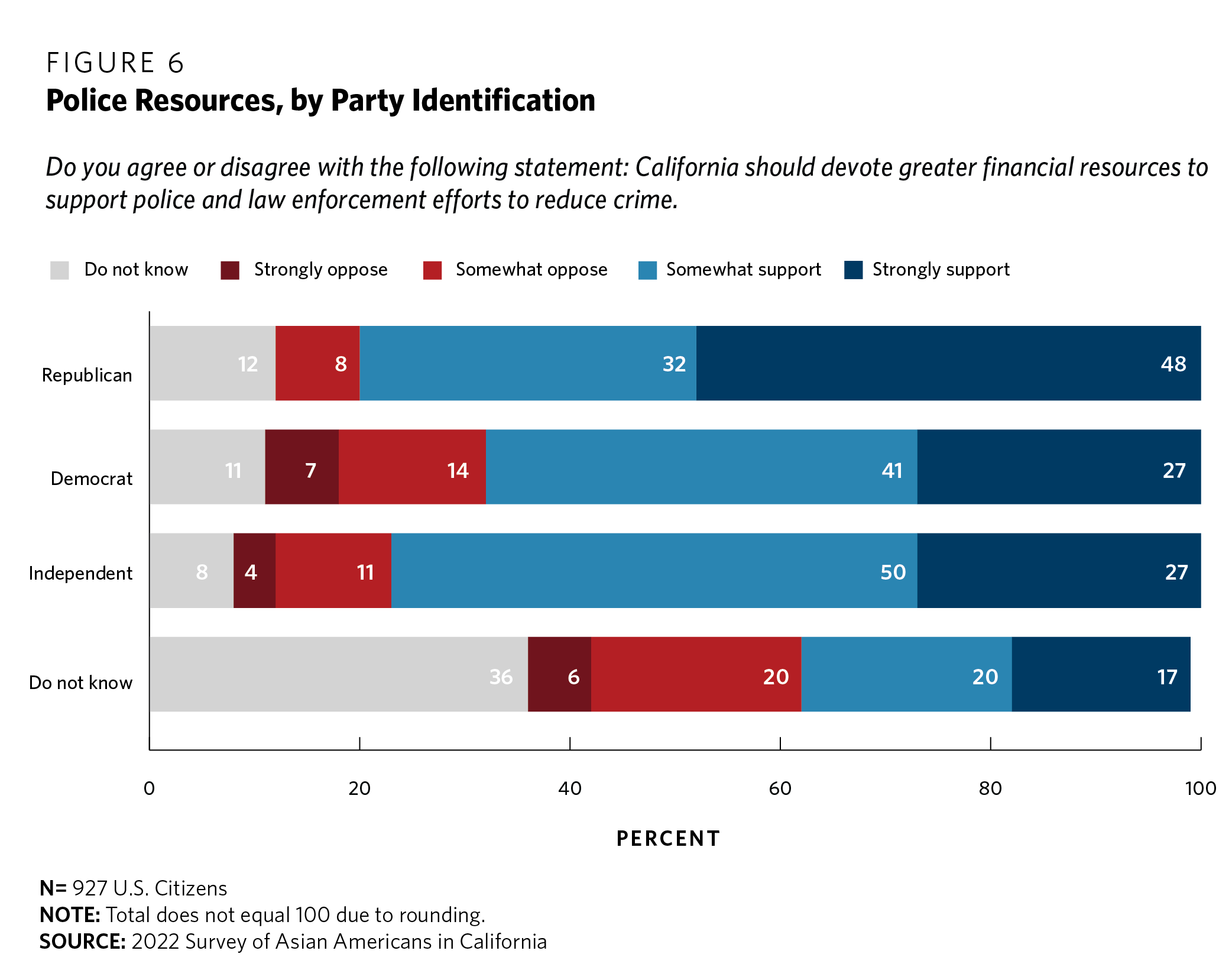 While our survey cannot necessarily determine whether crime is emerging as a wedge issue, the data do suggest that support for stronger police action is greater among respondents who identify with the Republican Party (see figure 6).