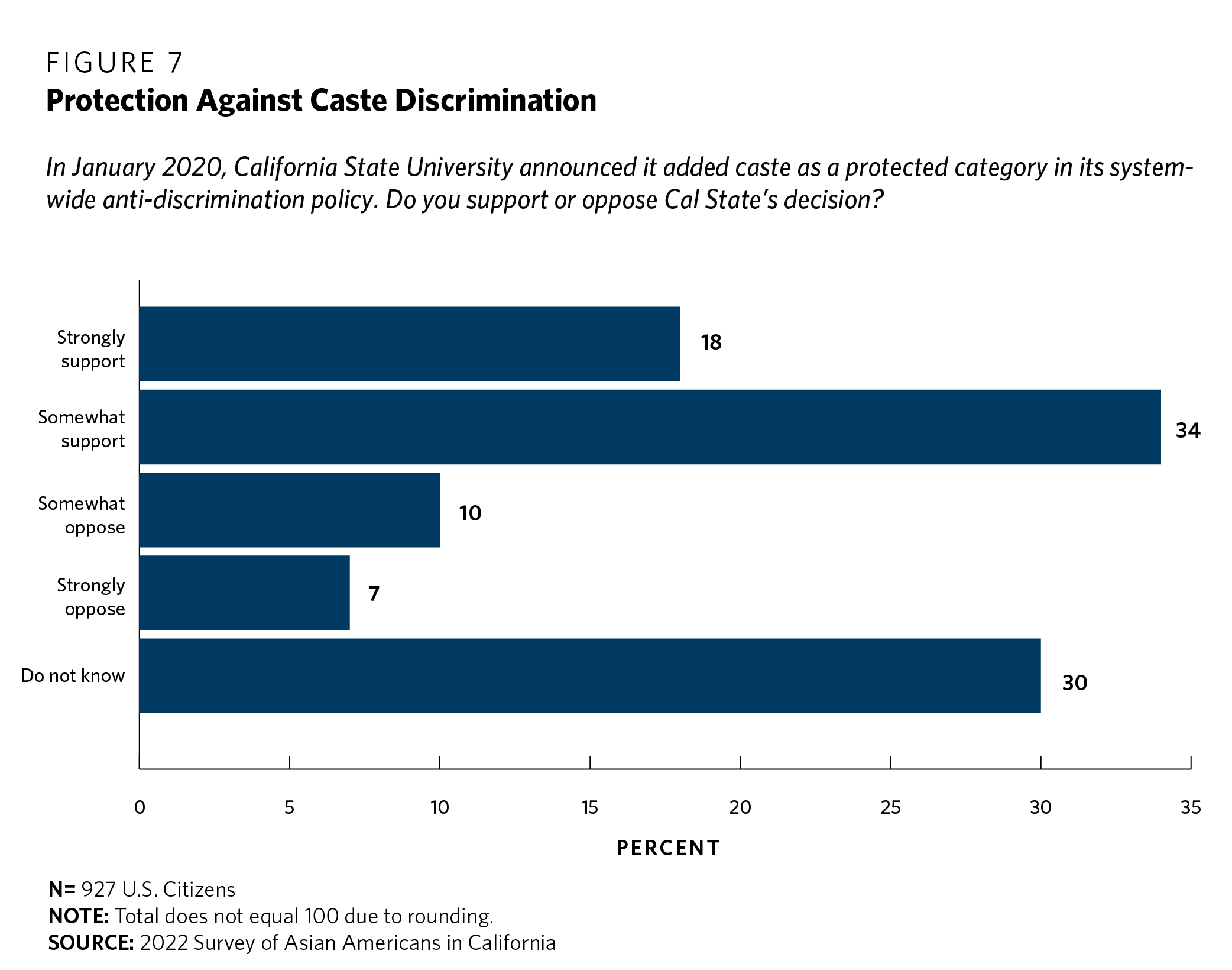 The investigation of attitudes and beliefs toward caste merits its own survey. But the Carnegie survey simply asked all respondents, irrespective of their ethnic heritage, whether they supported or opposed California State University’s decision. A slim majority—52 percent—of respondents supported Cal State’s move to add caste as a protected category (see figure 7). Eighteen percent “strongly” supported the measure, and another 34 percent “somewhat” supported the measure. Opposition was muted: just 17 percent either “somewhat” or “strongly” opposed the measure. Somewhat unsurprisingly, given that the salience of caste is primarily confined to the South Asian community, nearly one in three respondents (30 percent) did not express a view.