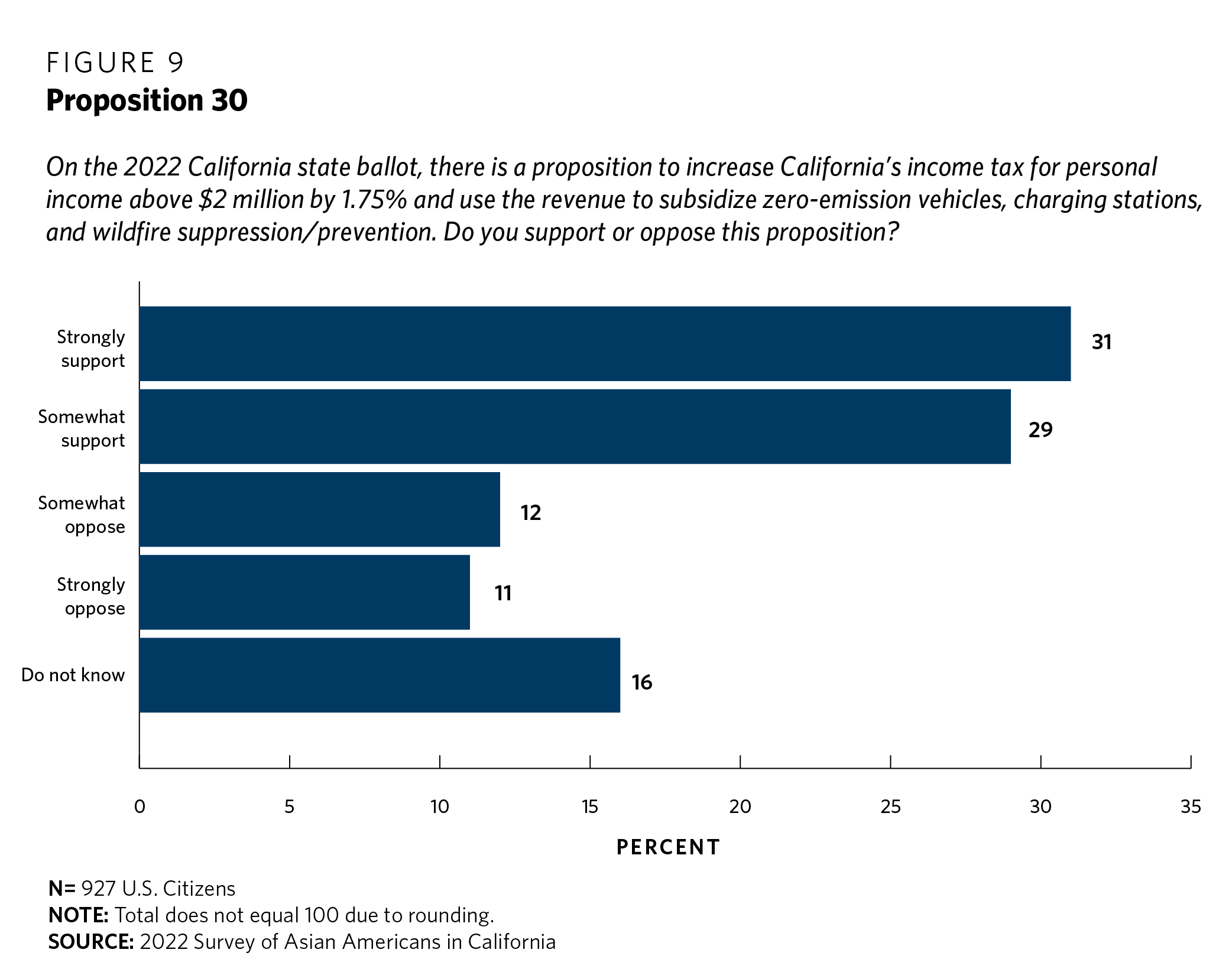 In response to a question inquiring about their support for this initiative, 66 percent of respondents expressed support (split evenly between those who “somewhat” or “strongly” supported the measure) (see figure 10). Twelve percent “somewhat” opposed the proposition while 9 percent “strongly” opposed it, and twelve percent were unsure. Interestingly, there was little variation on this question by respondents’ income bracket or education level.