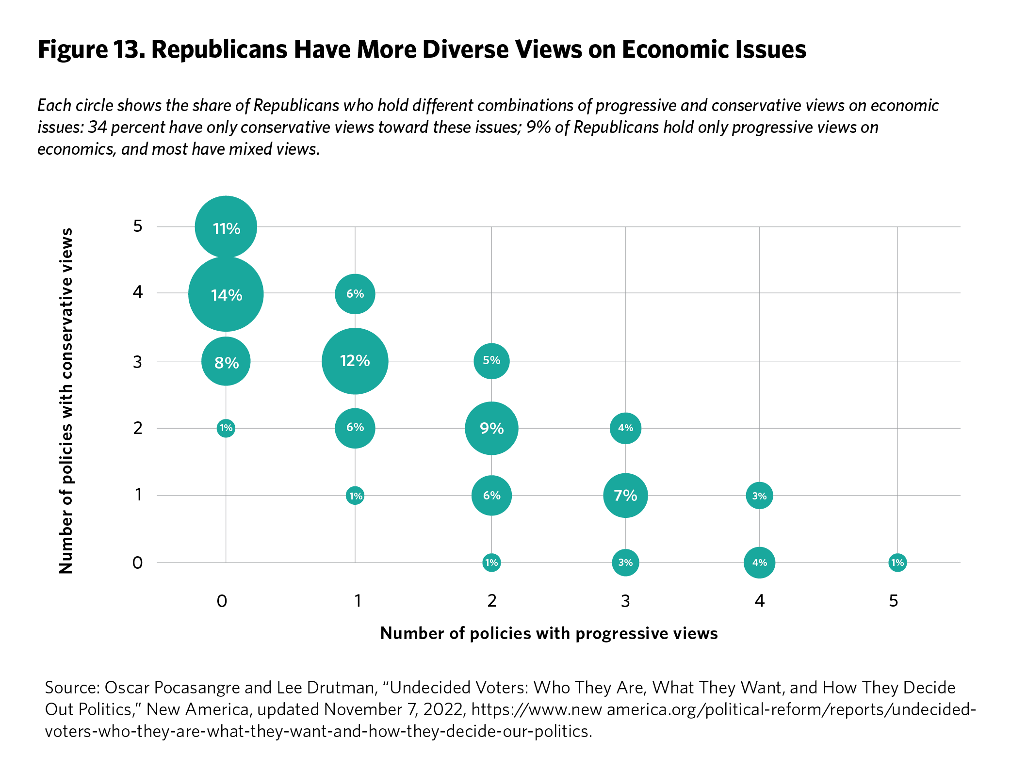 It is a common assumption that people who hold views from both sides of the aisle are economically conservative and socially liberal—the profile of many in the upper-middle-class political elite trying to reduce polarization. In fact, a 2016 study showed that this type of moderate ideology was held by only 3.8 percent of the electorate. Instead, the preponderance of Americans who respond to ideological survey questions with answers on both sides of the aisle (28.9 percent of the electorate) tend to be pro–economic redistribution while also upholding the belief that American citizens should be White, Christian, and born in the United States.44 That mix of views led this group to be swing voters for many years, although since 2016 many have moved more decisively into the Republican Party.
