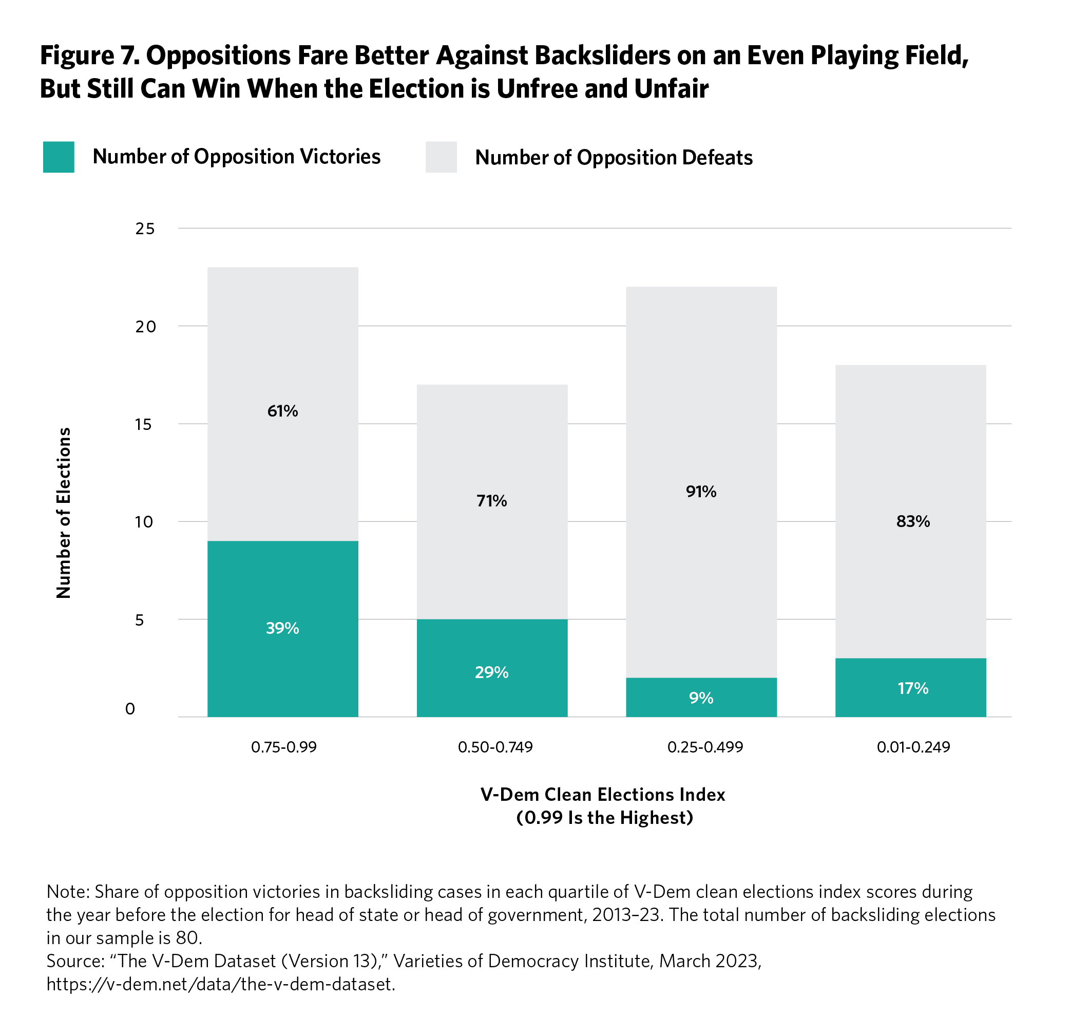 Likewise, oppositions can still win even in undemocratic contexts. Figure 6 shows that when the backsliding country was still above a V-Dem LDI score of 0.75, indicating a relatively strong liberal democracy, the odds were unsurprisingly 50–50 for an opposition to defeat the incumbent. Those odds fell marginally in contexts where the country’s LDI score was between 0.74 and 0.50, indicating a democracy with some deficits. Once the country fell below the 0.50 mark, often indicating a slide toward electoral authoritarianism, the odds of an opposition victory fell precipitously by more than half. But even in more clearly autocratic contexts (the bottom quartile of the LDI score), oppositions won 13 percent of the time.