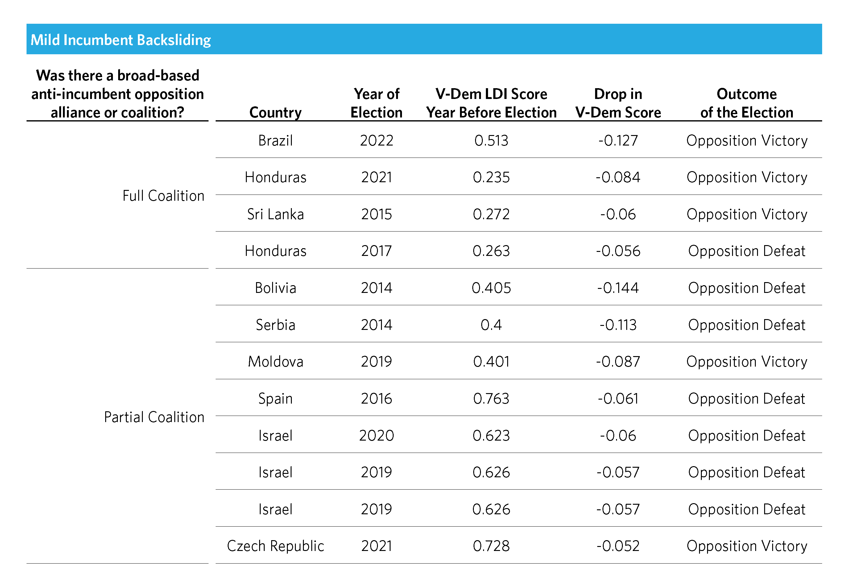 We considered a coalition strategy to be “partial” in cases where the opposition took steps to build an unusual electoral coalition for the purpose of ousting the backsliding incumbent, but it only partially succeeded. In these instances, generally the groundwork was laid for a coalition, but it did not attract a significantly broad group of partners, or multiple coalitions were formed and did not consolidate under one big tent.